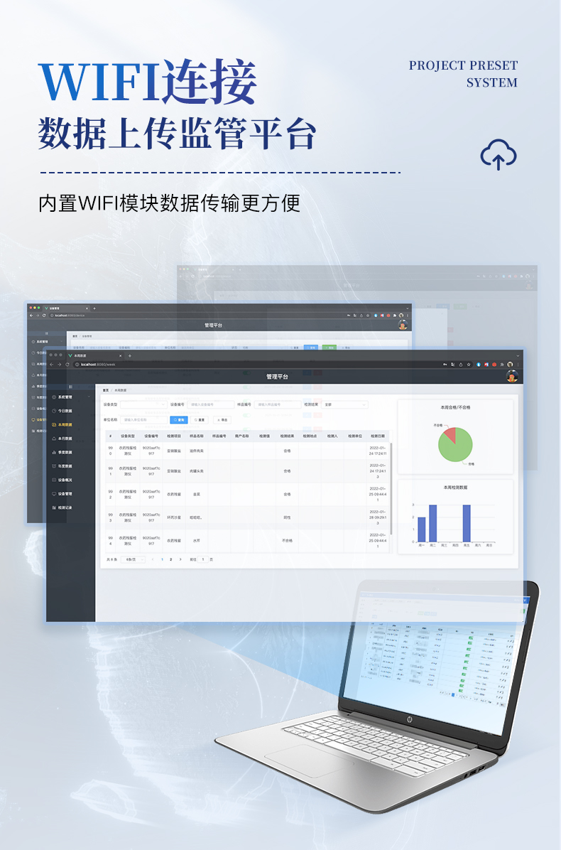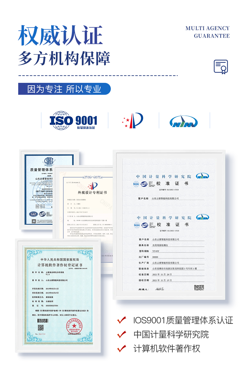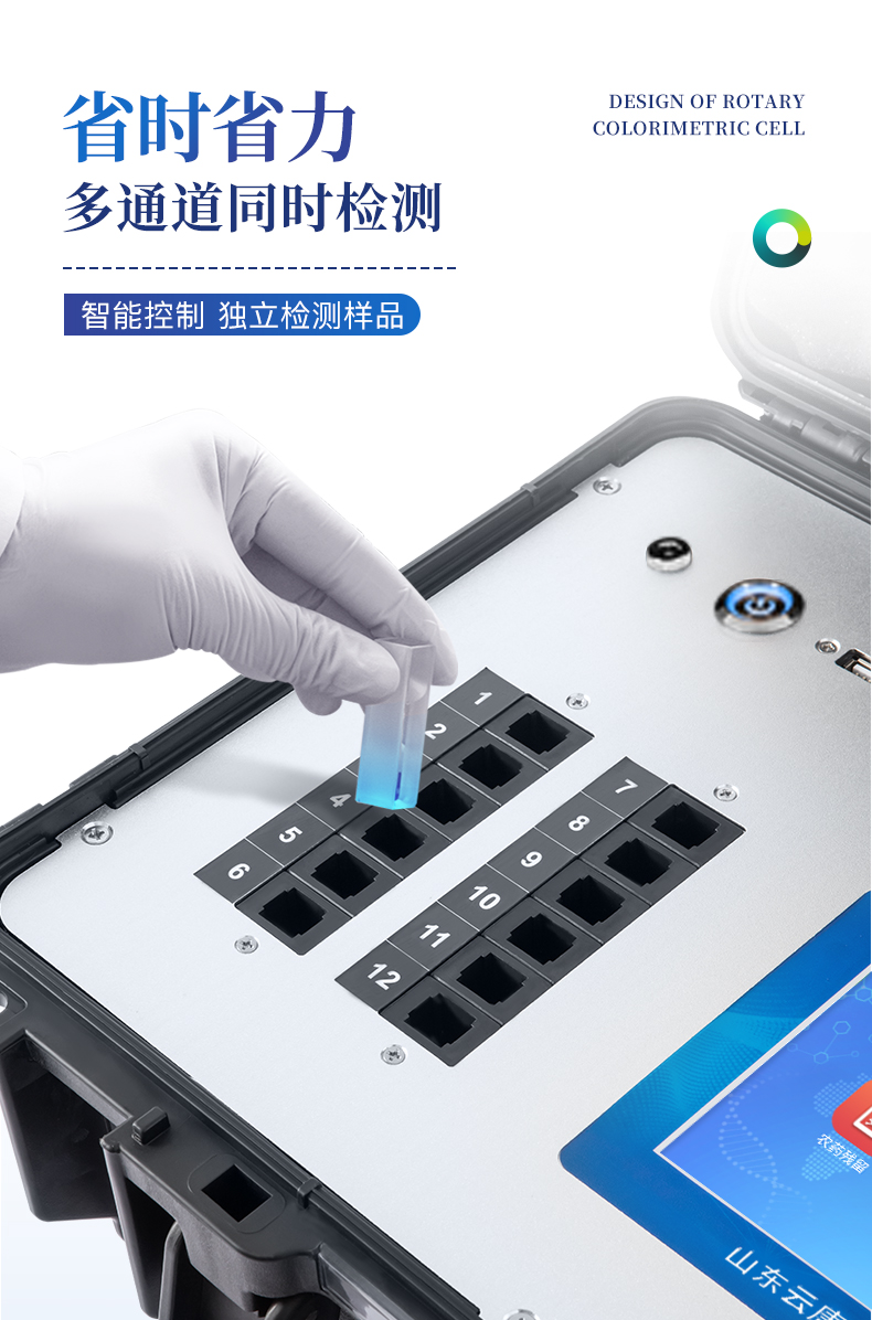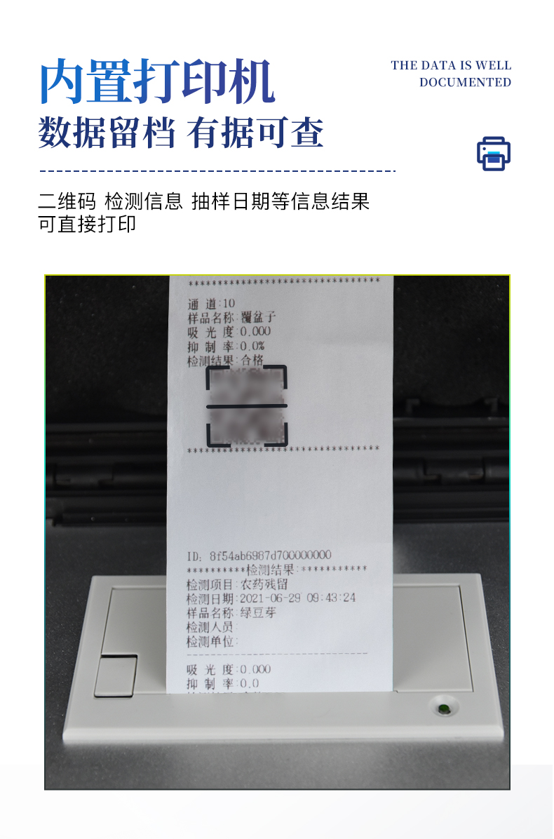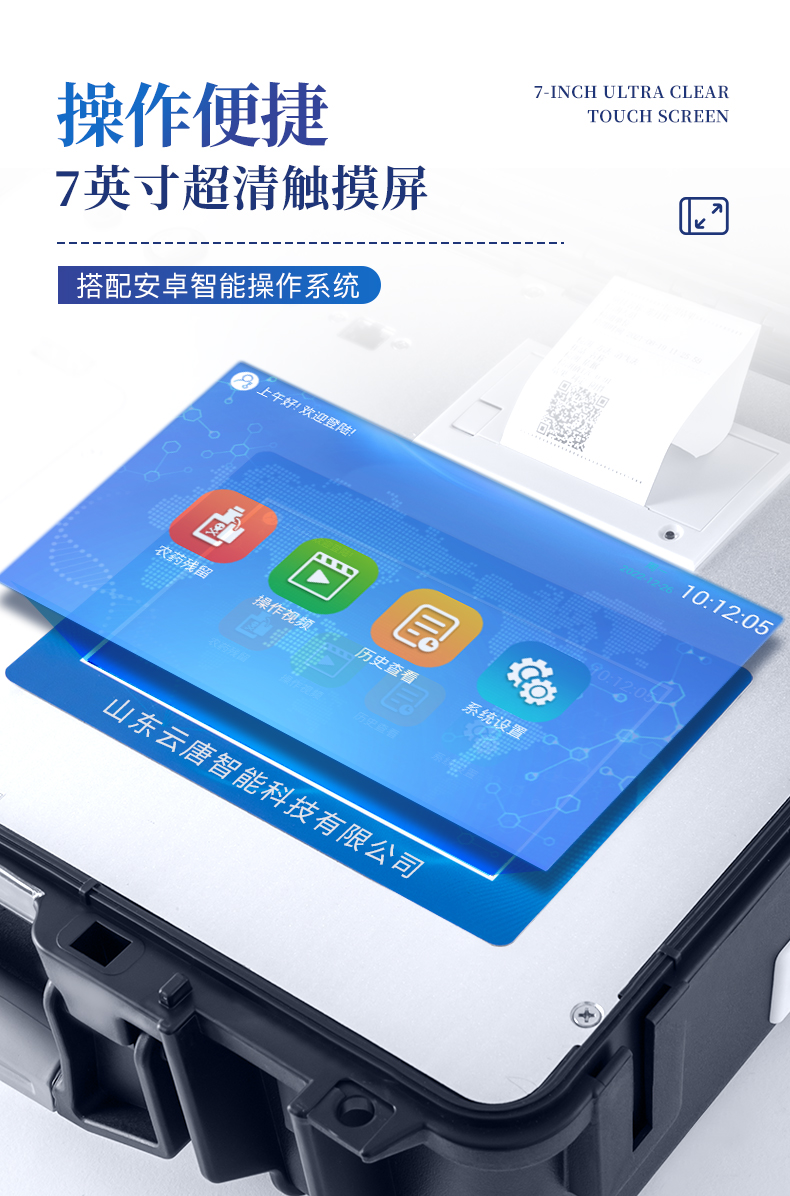 | 机箱采用工业级ABS工程塑料箱,方便携带,稳固耐用,便于流动测试。 | 智能操作系统,采用更加人性化操作,主控采用多核处理器,主频1.88Ghz,运转速度更快速,稳定性更强。 | 自动判断样品是否合格,检测结果更加直观。 | 仪器具有100多种蔬菜名称菜单库,分类管理,并可按需添加或删除蔬菜名,编辑蔬菜名称,可直接打印出蔬菜名称。 | 检测通道:18个检测通道,可以同时测试多个样品,循环检测,即放即检,每个样品由程序控制分别独立工作,不会互相干扰。 | 仪器具有wifi联网功能,可将数据快速上传电脑,进行数据管理与统计,4G信号GPRS远传功能,可插手机卡实现数据远传平台,。 | 显示方式:7英寸高灵敏真彩触摸屏显示,人性化中文操作界面,读数直观、简单。 | 打印机采用串口5v打印,可选择手动打印或者自动打印,三分钟出打印结果,打印格式为检测人姓名、吸光度差值、检测时间、检测机构、样品名称及结果判定。 | 光源采用进口超高亮发光二极管,具有低功耗、高精度、稳定性强、光源可控可以关掉不使用的光源,响应速度快等优点。 | 智能恒流稳压,光强自动校准,长时间连续工作光源无温漂现象。 | 采用USB2.0接口设计,方便数据的存贮和移动,并可随时与计算机直接相连,并且可用计算机控制仪器。实现数据查询、浏览、分析、统计、打印等。 | 智能化程度高,仪器具有自检功能:具有开机自检和调零功能,具有自动检测重复性功能 | 仪器具有自身保护功能,可设置用户名及密码,防止非工作人员操作等。 | 采用DC12v直流供电,安全系统更高,并且配备6A锂电池充电器。 | 仪器具有重新校准、锁定、恢复出厂设置功能。 |