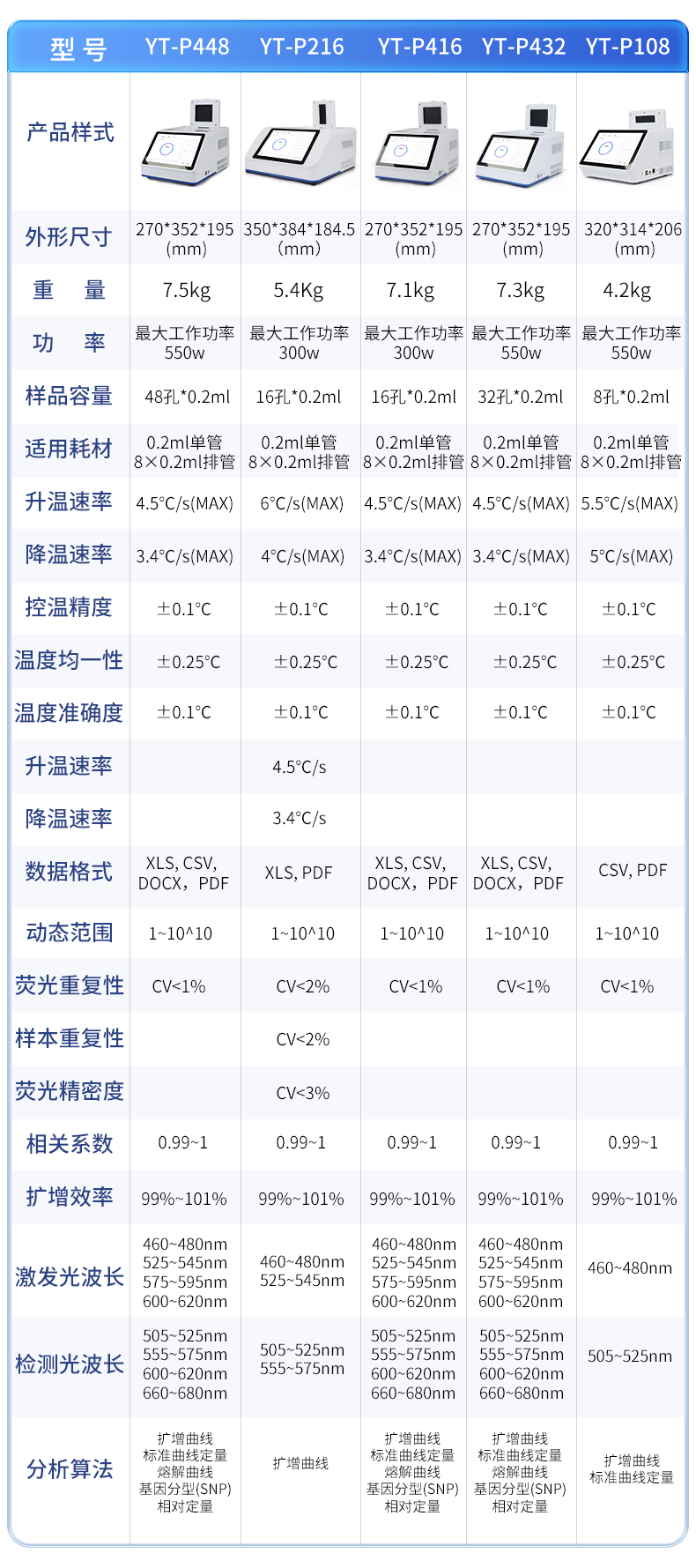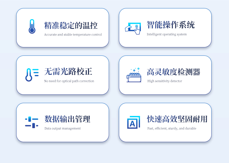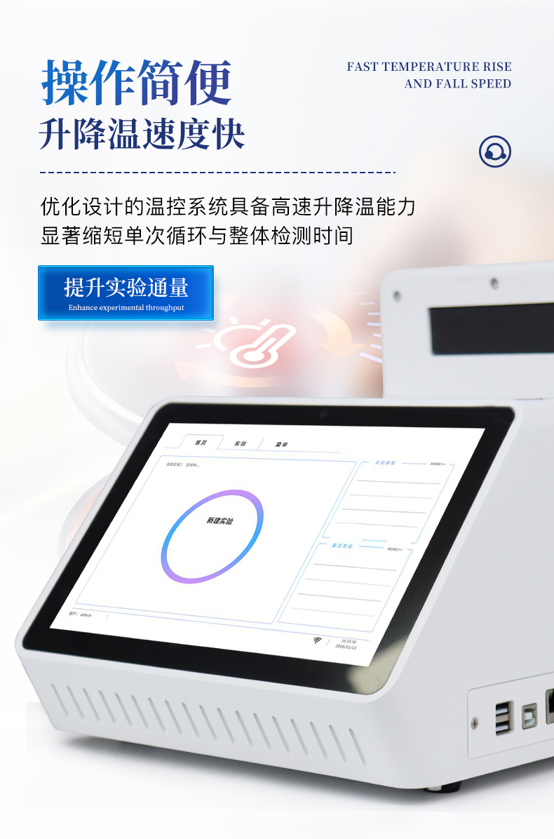 | 1.智能操作系统,实验尽在掌握 | A程序更新与预设:支持在线更新实验程序,并内置丰富的预设实验程序模板,用户亦可自定义保存常用模版,实现一键快速启动,极大提升操作效率。 | B操作简单:无论是触摸屏界面还是电脑软件,均设计得直观易懂,新用户也能快速上手。预置常用程序模板,进一步简化操作流程。 | 2.精准稳定的温控与光学核心 | A长久精准的温控系统:采用进口***TEC半导体制冷模块,控温精准(±0.1°C),孔间温度均匀性**(≤±0.3°C)。系统稳定性卓越,长期使用性能衰减小,校准周期长达数年,显著降低维护成本与运营中断。 | B免维护的灵敏光学系统:配备单个独立LED光源与单个独立光电二极管检测器,采用超长寿命进口光源,设计寿命期内免维护,无需额外校准或更换,保障检测结果长期一致性与高灵敏度。 | C卓越的数据质量:实验线性相关性高(R²≥0.999),重复性优异(孔间CV值低),确保定量结果准确可靠,数据置信度高。 | 3.**便捷的数据与输出管理 | A多重数据导出方式:支持通过USB存储设备直接拷贝,或经由Wi-Fi无线网络传输数据至本地服务器或云端,方便灵活,满足各类实验室数据管理习惯。 | B丰富的报告导出与打印:支持生成并导出多种格式(如PDF、Excel)的实验报告。仪器兼容USB热敏打印机、蓝牙无线打印机及常规A4打印机,可直接在仪器上或通过电脑一键导出并打印专业报告,便于结果存档与即时分享。 | 4.快速**与坚固耐用 | A升降温速度快:优化设计的温控系统具备高速升降温能力,显著缩短单次循环与整体检测时间,提升实验通量。 | B超长使用寿命:核心部件均选用工业级耐用材料与设计,整机运行稳定可靠,致力于为用户提供长久的投资回报。 |