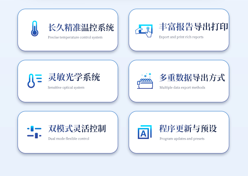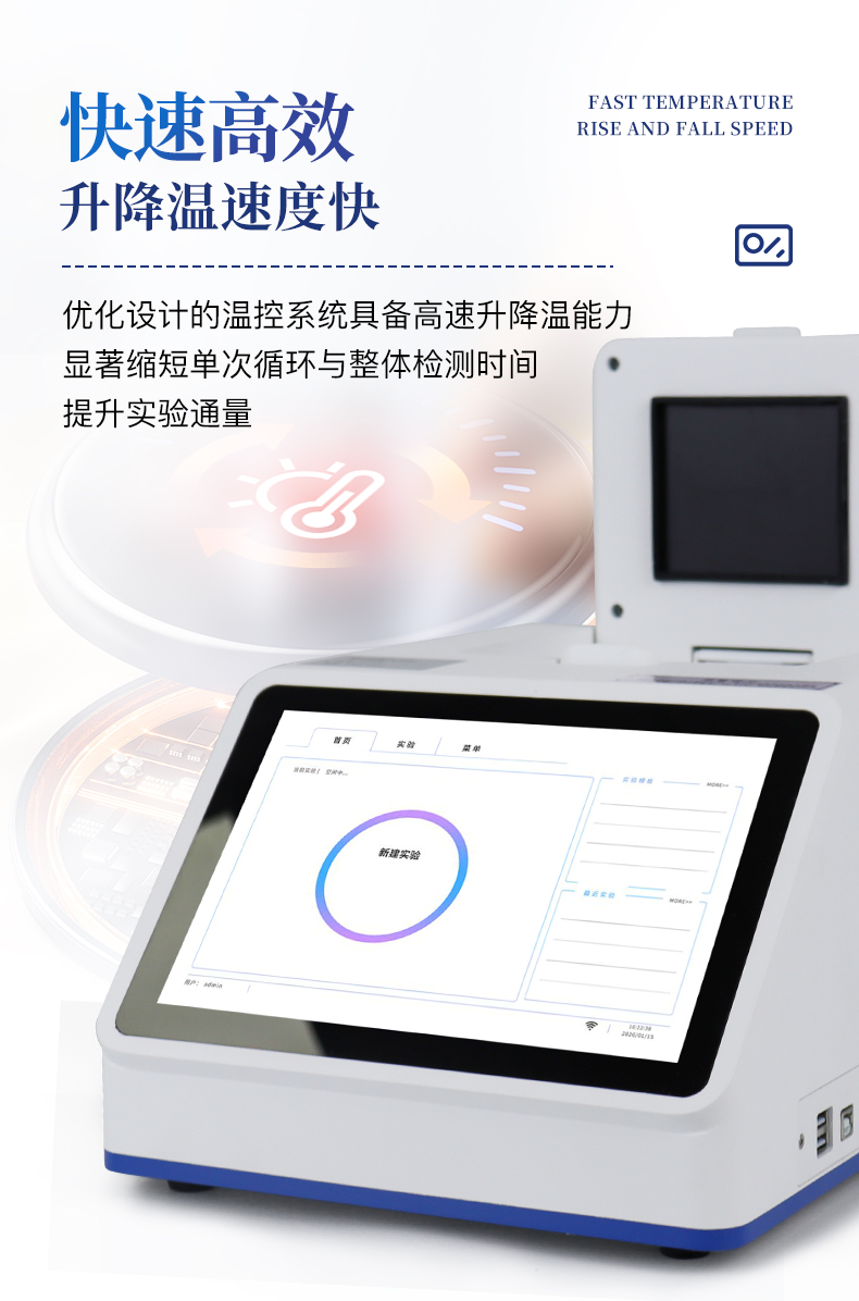| 1.智能操作系统,实验尽在掌握 | A双模式灵活控制:支持通过仪器触摸屏独立运行,也支持通过电脑软件进行远程控制与数据管理,适应不同实验场景需求。 | B程序更新与预设:支持在线更新实验程序,并内置丰富的预设实验程序模板,用户亦可自定义保存常用模版,实现一键快速启动,极大提升操作效率。 | C极简启动体验(可选配):可定制集成摄像头扫描系统,用户只需扫描样品板或程序卡的二维码,即可自动识别并调用对应实验程序,简化流程,避免人为设置错误。 | D操作简单:无论是触摸屏界面还是电脑软件,均设计得直观易懂,新用户也能快速上手。预置常用程序模板,进一步简化操作流程。 | 2.精准稳定的温控与光学核心 | A长久精准的温控系统:采用进口***TEC半导体制冷模块,控温精准(±0.1°C),孔间温度均匀性**(≤±0.3°C)。系统稳定性卓越,长期使用性能衰减小,校准周期长达数年,显著降低维护成本与运营中断。 | B免维护的灵敏光学系统:配备4个独立LED光源与4个独立光电二极管检测器,实现四通道荧光同步精准检测。采用超长寿命进口光源,设计寿命期内免维护,无需额外校准或更换,保障检测结果长期一致性与高灵敏度。 | C卓越的数据质量:实验线性相关性高(R²≥0.999),重复性优异(孔间CV值低),确保定量结果准确可靠,数据置信度高 | 3.**便捷的数据与输出管理 | A多重数据导出方式:支持通过USB存储设备直接拷贝,或经由Wi-Fi无线网络传输数据至本地服务器或云端,方便灵活,满足各类实验室数据管理习惯。 | B丰富的报告导出与打印:支持生成并导出多种格式(如PDF、Excel)的实验报告。仪器兼容USB热敏打印机、蓝牙无线打印机及常规A4打印机,可直接在仪器上或通过电脑一键导出并打印专业报告,便于结果存档与即时分享。 | 4.快速**与坚固耐用 | A升降温速度快:优化设计的温控系统具备高速升降温能力,显著缩短单次循环与整体检测时间,提升实验通量。 | B超长使用寿命:核心部件均选用工业级耐用材料与设计,整机运行稳定可靠,致力于为用户提供长久的投资回报。 |