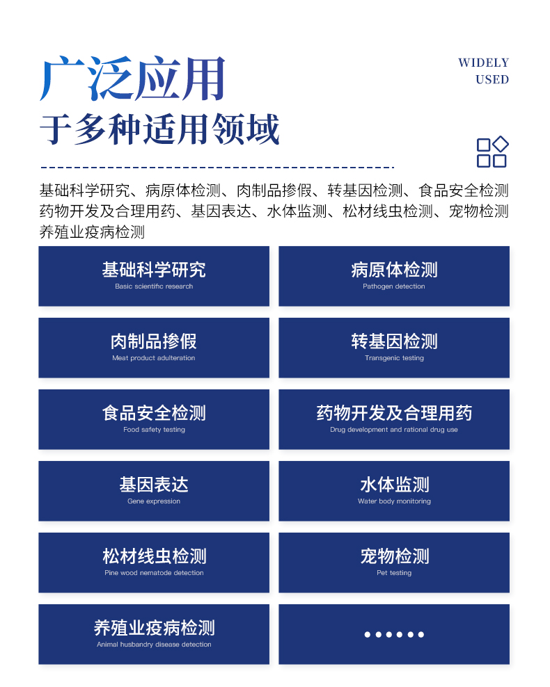 非洲猪瘟检测仪配套非洲猪瘟病毒荧光pcr检测试剂盒、非洲猪瘟病毒荧光pcr核酸检测试剂盒均已经获得农业农村部产品批准,可以满足非洲猪瘟核酸现场快速检测需求。可定量快速畜牧类疾病诊断如非洲猪瘟、禽流感、猪瘟、猪蓝耳、伪狂犬等疾病,广泛应用于养殖场、屠宰场、食品加工厂、肉产品深加工企业、农业农村部、畜牧局、检验检疫单位使用。