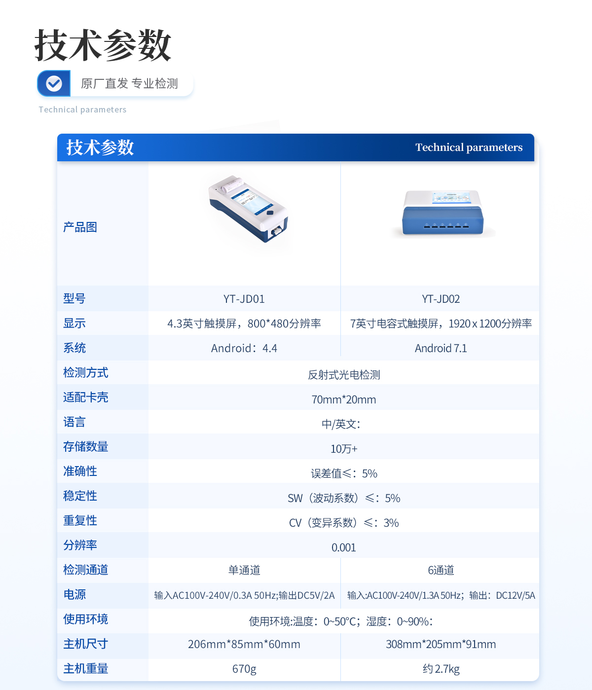 | 1、 10.1英寸电容式触摸屏,分辨率:1280:x:800,内部存储:1+8GB | 2、 操作系统:Android:7.1 | 3、 检测方式:反射式光电 | 4、 语言:中/英文: | 5、 存储数量:10万+ | 6、 准确性:误差值≤:5% | 7、 稳定性:SW(波动系数)≤5% | 8、 重复性:CV(变异系数)≤3% | 9、 分辨率:0.001 | 10、 ★通道:6个单卡卡槽(70mm*20mm*5.6mm);1个三联卡卡槽(70mm*40mm*5.6mm) | 11、 检测时间:<:5秒:(单卡及多联卡);可对样本进行胶体金定性/半定量检测、荧光定量 | 12、 打印机:热敏打印机(热敏打印纸:57*30mm) | 13、 数据传输:WiFi、蓝牙、USB、射频读卡、外置扫码模块(选配) | 14、 数据处理:可通过通讯端口进行数据汇总、上传监管平台等 | 15、 检测通道孵育检测一体,温度范围::室温:+5℃:~:60℃ | 16、 接口:USB接口:2个;USB-B接口:1个;LAN接口:1个:;DC电源接口:5.5/2.1mm | 17、 电源:输入:AC:220V:±:20V,:50Hz:±:1Hz;输出:DC:12V,:5A | 18、 使用环境:温度:0~50℃;湿度:0~90%: | 19、 主机尺寸::382mm:x:300mm:x:117mm | 20、 主机重量:约:3.6kg |