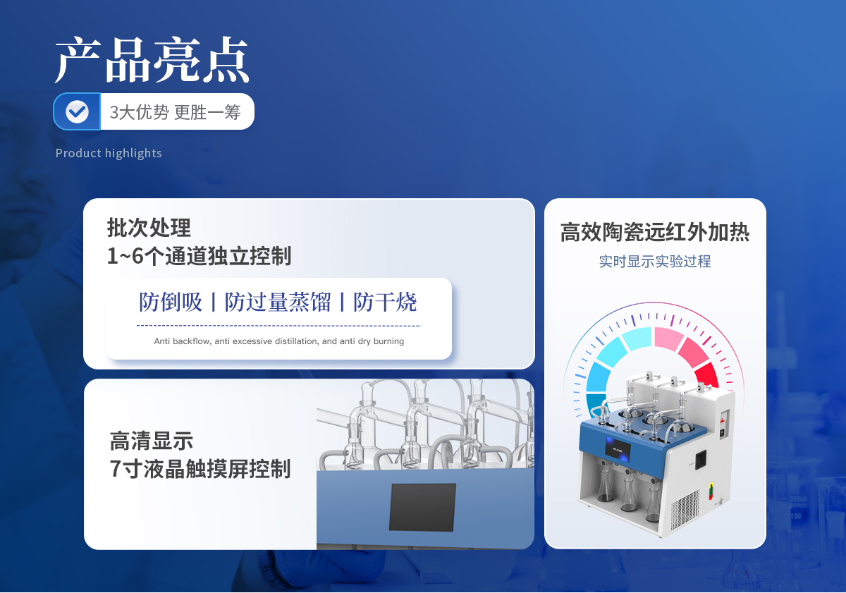 1.自动化程度高:内置冷却水循环机,实现全自动化操作,提高实验效率与准确性。2.多通道独立控制:3个加热单元各自独立,配备防倒吸、防过量蒸馏及防干烧保护。3.智能触控:7寸液晶触摸屏,支持自定义保存*多1000种蒸馏方法,内置18种国标方法。4.精准控制:采用**陶瓷远红外加热,具备时间与重量双重终点控制,确保蒸馏精度达0.1ml。5.安全可靠:集成自动清洗、自动气密检查、反吹等功能,确保设备长期稳定运行。6.操作简便:一键启动,支持远程OTA系统升级,满足不同用户的使用需求。