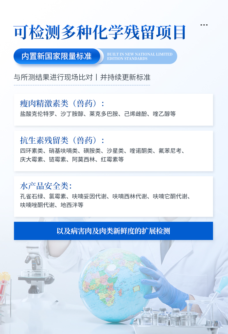 适用于鱼、虾等水产中孔雀石绿、氯霉素、硝基呋喃类:呋喃唑酮(AOZ)、呋喃它酮( AMOZ )、呋喃妥因(AHD)、呋喃西林(SEM)、呋喃那斯、磺胺类、激素类、四环素类、金霉素、土霉素、甲砜霉素、氟苯尼考、喹诺酮类药物:噁喹酸、诺氟沙星、恩诺沙星、环丙沙星、氧氟沙星的定性定量检测。