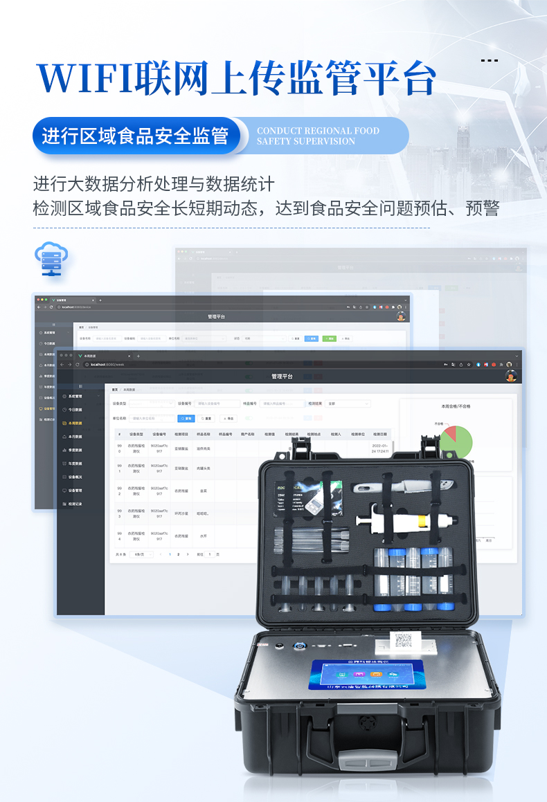 | 安卓智能操作系统,采用更加**和人性化操作,仪器具有网线连接、wifi联网上传、4G无线远传功能,快速上传数据。 | 智能化程度高,仪器具有自检功能:具有开机自检和调零功能,具有自动检测重复性功能。 | 新一代高速热敏打印机,检测完成可自动打印检测报告和二维码。 | 仪器带有监管平台,数据可局域网和互联网数据上传,检测结果直接传至食品安全监管平台。进行区域食品安全监管及大数据分析处理与数据统计,检测区域食品安全长短期动态,达到食品安全问题预估、预警 | 一体化便携式快检设备,满足现场及流动检测使用需求,能够在同一软件下实现所有检测项目的检测,并可通过同一窗口直观显示检测结果。 | 胶体金模块检测方式:轨道式自动传输扫描,检测完成后自动退出检测卡。 | CT线自动识别,无需手动调整。 | 仪器具有品类多种类样品菜单库,可灵活选择检测样品,不同的检测通道可同时检测不同的样品项目。 | 样品处理简单省力,整体操作快速、安全、便捷。 | 仪器具有自身保护功能,可设置用户名及密码,防止非工作人员操作等。 | 高灵敏度,高检测精度,高重复性精度,扫描式高精度光学传感器。 | 内置强大的数据库,可在仪器上直接选择样品名称、检测指标、送检单位等信息,也可在仪器上直接编辑录入样品名称、检测指标、送检单位等信息并保存进样品数据库。 | 仪器具有重新校准、锁定、恢复出厂设置功能。 | 结果判定线可修改,对照值标定值可保存,断电不丢失数据。 | 兼容市场上所有的胶体金卡,使用耗材不受限制,极大增强用户使用体验。 |