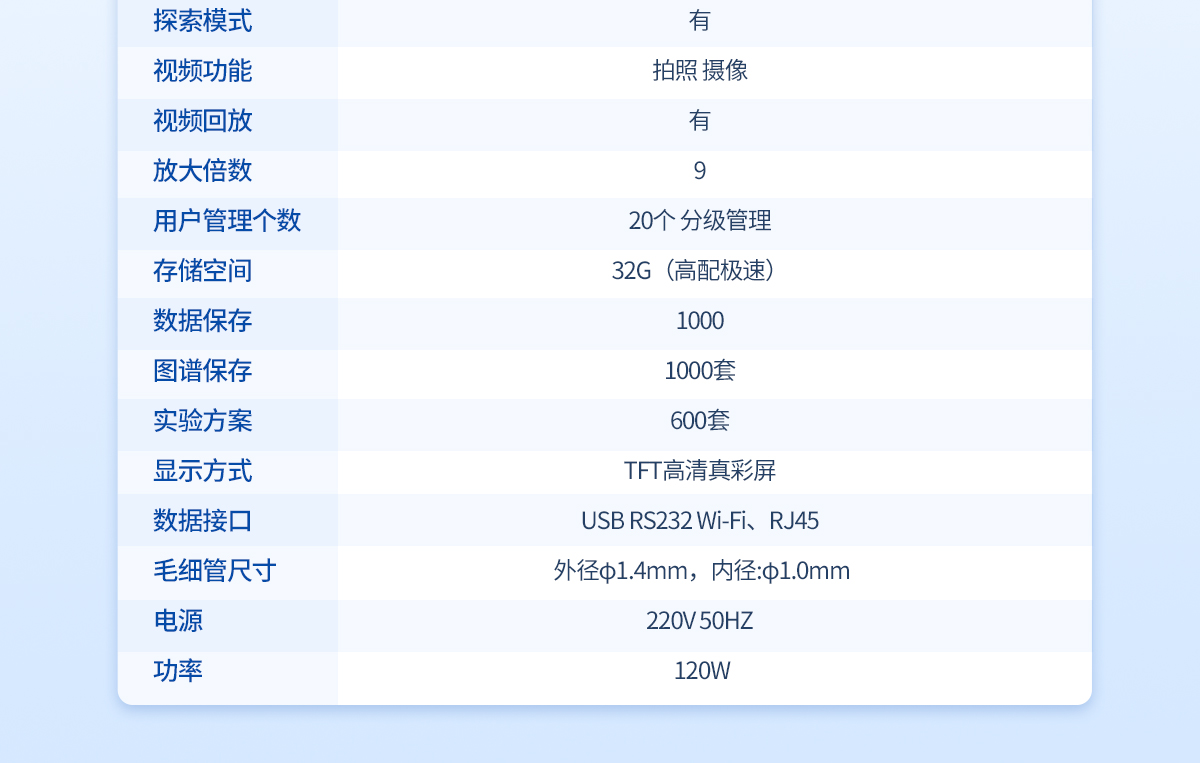 | 温度范围: 室温-400℃ | 检测方式: 手动 | 处理能力: 4个/批(同时可以做四个样) | 判断能力: 视频目视 | 温度分辨率:0.1℃ | 升温速率: 0.1℃--20℃ (200档 无极可调) | 控温方式: PID**控温 炉体全密闭设计 | 加热方式: 传导液加热法或者电热块空气加热法(选配) | 升温分辨率:0.1℃ | 升温速率: 0.1℃/Min-20℃/Min | 准确度: ±0.2℃(<200℃);±0.4℃(>200℃) | 重复性: 0.1℃/Min时熔点重复性±0.1℃ | 校正功能: 具备 | 探索模式: 有 | 视频回放: 有/有时间水印 | 高清摄像头:观察样品熔融状态 | 放大倍数: ≥10 | 用户管理个数:30个以上 分级三级管理 | 存储空间:32G硬盘,≥2G内存 | 试验方法:有 | 数据保存:有 | 图谱保存:200 | 内存扩展:可以 | 网 络 :无线WIFI | 显示方式:8寸高清彩屏 | 数据接口:USB,网络WiFi接口,RS232 | 数据真实性:防篡改功能 | 数据导出:可用U盘导出 | 数据输出形式:PDF格式和EXCL数据 | 数据溢出提醒:提前自动提醒 | 打印机:选配激光打印机或热敏/针式(兼容) | 毛细管尺寸: 外径φ1.4mm,内径:φ1.0mm | 电源:220V 50HZ 功率:120W |