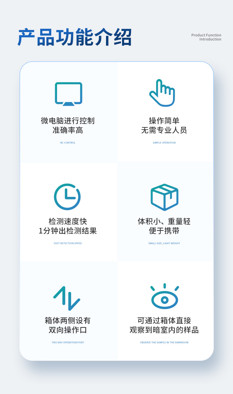 ★1、采用微电脑进行控制,准确率高 ★2、操作简单,无需专业人员★3、检测速度快,1分钟出检测结果★4、体积小、重量轻、便于携带