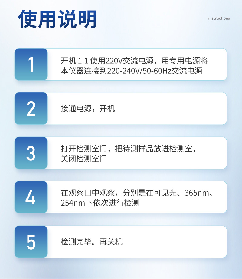 1、开机 1.1 使用220V交流电源,用专用电源将本仪器连接到220-240V/50-60Hz交流电源。2、操作程序2.1 接通电源,开机2.2 打开检测室门,把待测样品放进检测室,关闭检测室门2.3 在观察口中观察,分别是在可见光、365nm、254nm下依次进行检测。2.4 检测完毕。再关机。