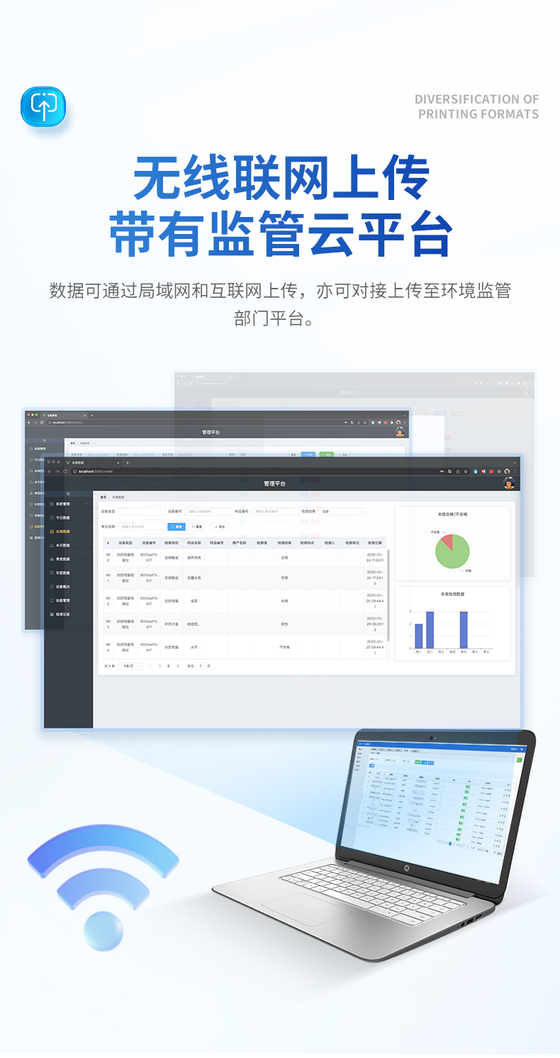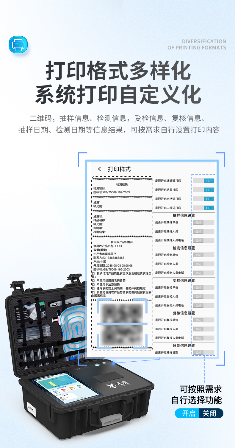 | 1、仪器采用10.1英寸液晶触摸屏显,搭配运行安卓智能操作系统,主控芯片采用ARM Cortex-A7,RK3288/4核处理器,主频1.88Ghz,运转速度更快速,性能更强。 | 2、仪器功能包括:胶体金检测模块、数字化管理模块、无线通讯模块等,可以满足同一软件下实现所有检测项目的检测,并在同一窗口展示检测结果。 | 3、一体化便携式快检设备,采用交直流两用供电方式,可连接车载电源,配备6ah大容量充电锂电池,可以满足现场及流动检测使用的需求。仪器尺寸:43×35×20cm, 主机净重:5.1kg | 4、系统自带数据集成模块,设备首页自动统计检测数据包含:周检测数据、月检测数据,全部检测总数量,均包含检测总数,合格数,不合格数,以及相关柱形分析图,对各项检测数据清晰掌握,无需电脑查询,更加快捷直观。 | 5、仪器具有任务预设模块,可在样品送检前提前预设样品名称、检测指标、送检单位等信息,样品送检时一键调取保存信息,检测更加方便快捷。 | 6、胶体金检测模块: 轨道式自动传输扫描方式,可实时显示金标卡实时图像,系统自动分析并呈现出CT曲线图,CT线自动识别,无需手动调整,完成检测后自动退出检测卡。 结果判定线可修改,对照值标定值可保存,断电不丢失数据。 兼容市场上其他胶体金卡,使用耗材不受限制,极大增强用户使用体验。 | 7、图像调整功能:可根据金标卡读取图像进行多方位调整,使其更精准读取结果。 | 8、仪器检测系统拥有庞大数据库,并且构建了完善的检索、修订功能。食品库涵盖多种样品名称,可按需添加或删除、编辑样品名称;产品数据库以及历史检测记录支持一键检索功能。 | 9、系统打印自定义化,打印格式多样化,产品合格证(国家标准要求),二维码,抽样信息、检测信息,受检信息、复核信息、抽样日期、检测日期等信息结果,可按需求自行设置打印内容。 | 10、A4纸版本报告打印功能:设备拥有两种结果展示方式,可以自动生成A4打印模板和小票打印模板两种样式,可通过WiFi及网线等方式链接外置打印机可进行打印 | 11、仪器具有 wifi 联网上传、RJ45网线连接功能,可以快速上传数据。同步对接监管平台,数据可局域网和互联网数据上传,检测结果直接传至食品安全监管平台。进行区域食品安全监管及大数据分析处理与数据统计,检测区域食品安全长短期动态,达到食品安全问题预估、预警。 | 12、设备支持U盘存储,标准USB接口,免驱动安装。检测结果存储容量20万条以上,可生成Excel表格,进行一键拷贝,并具有登录保护功能,可设置用户名及密码,规范不同人员操作权限,防止非工作人员操作,并且可以进行重新校准、锁定、恢复出厂设置功能。仪器固件可升级,后期检测项目可扩充。 | 13、仪器具备远程升级功能,可定向分客户分仪器更新,开机后自动更新,并可持续性免费更新系统版本,无需像传统产品返厂更新,节省时间及人力成本并避免了物流运输返厂升级导致设备损坏的潜在风险。 |