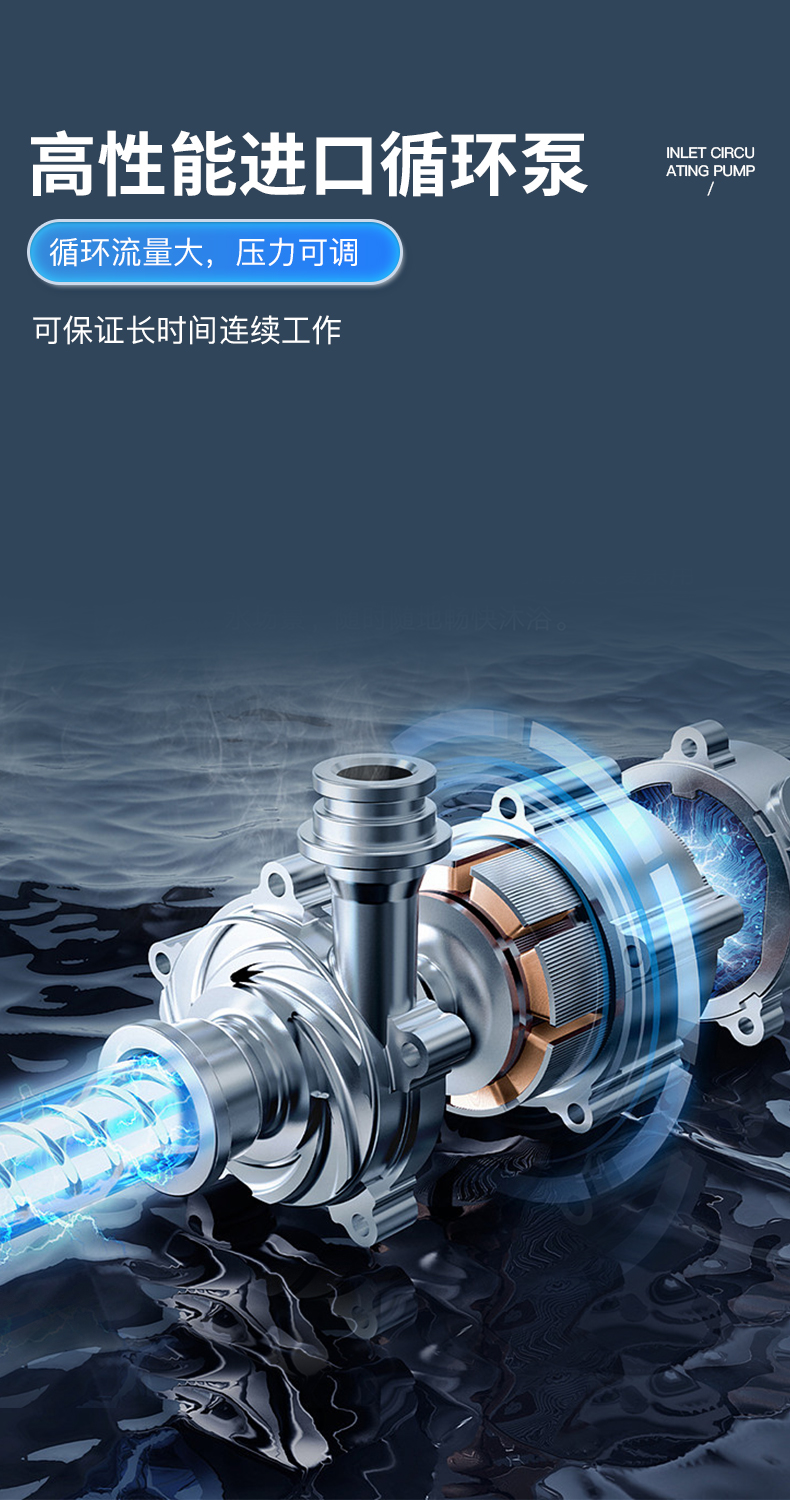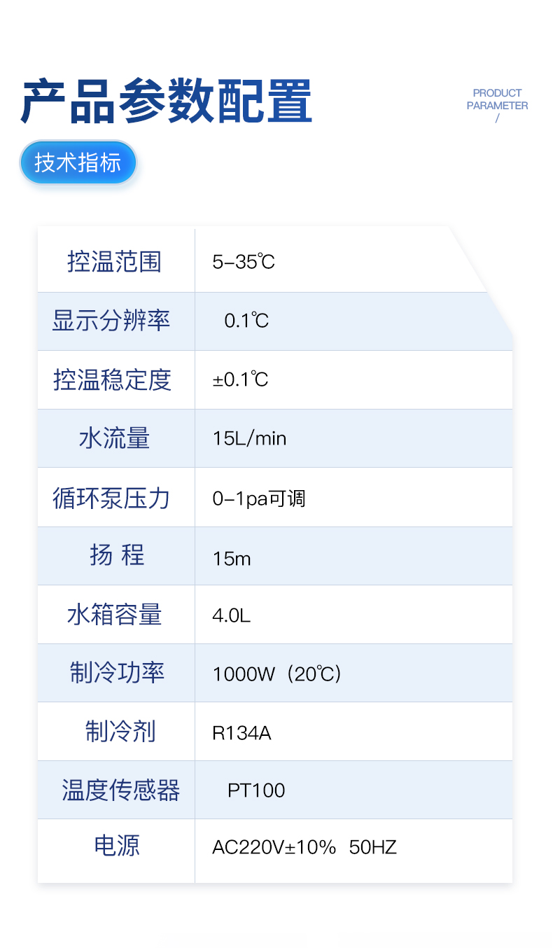 电压:220V AC | 频率:50HZ | 工作电流:3.2-8.6A | 压缩机功率:1050W/1.2HP | 制冷量:3KW±5% | 冷媒充注量:R410a/480g | 节流器:毛细管 | **扬程:15m | **流量:12L/min | 水泵功率:55瓦 | 出水口:φ10铜咀宝塔(默认) | 水箱容量:9L | 尺寸:长*宽*高740*480*840mm | 净重:65Kg | 保护:水流保护、水温超高报警、水温超低报警、压缩机过载保护、室温超高报警 |