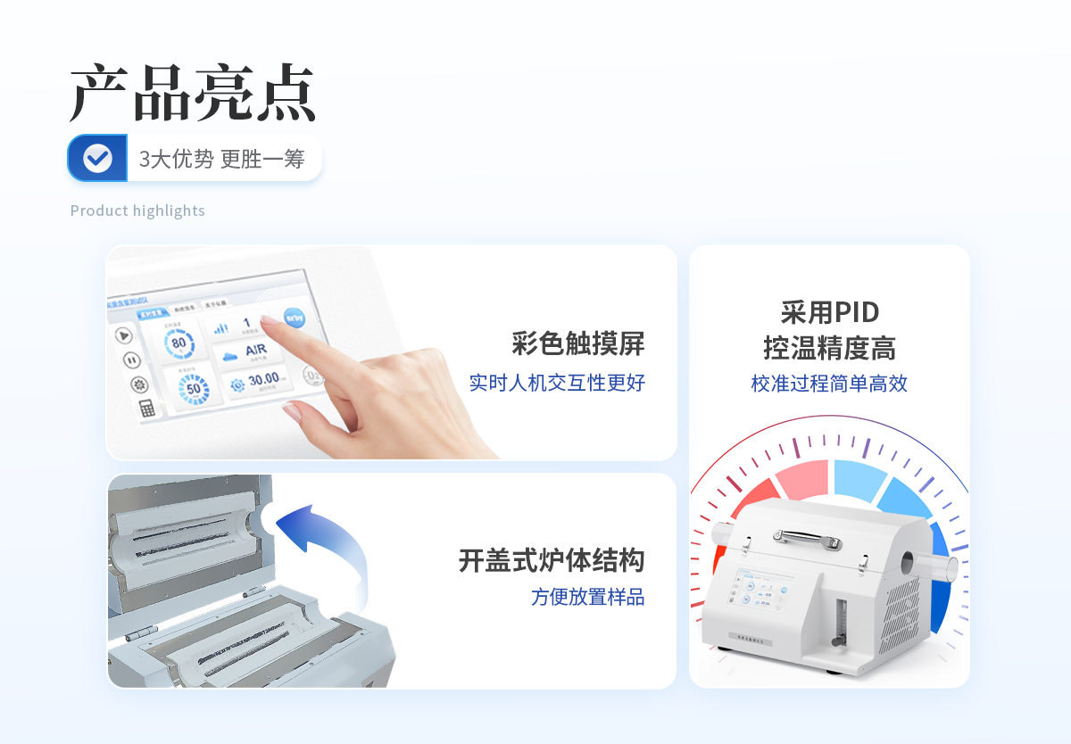 1. 采用开盖式炉体结构,方便放置样品且散热效果更佳。 | 2. 炉膛采用超长加热单元,可同时测试4组样品,大大提高测试效率。 | 3. 软件自带计算功能,可以一键自动计算出炭黑含量、灰分含量,非常得方便快捷。 | 4. 采用PID精准控温,控温精度高,温度范围大,炉膛温度均匀性高。 | 5. 7寸液晶触摸屏显示,可一键操作启动,设定恒温时间,恒温精度高; | 6. 智能化可编程控制,可设置多组分段升温程序。 |